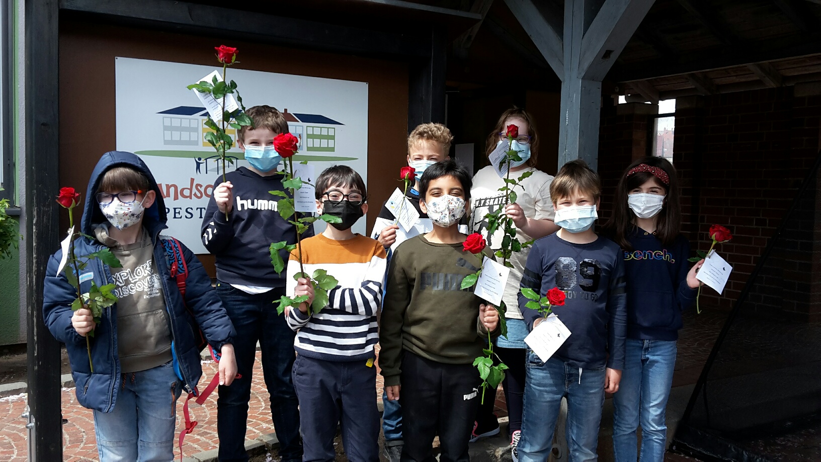 An der Pestalozzischule in Elversberg brachte am 7.05.2021 jedes Kind eine rote Rose zum Muttertag mit nach Hause. An der Rose war eine Karte befestigt, die darauf hinweist, dass es eine FAIRTRADE – Rose ist.